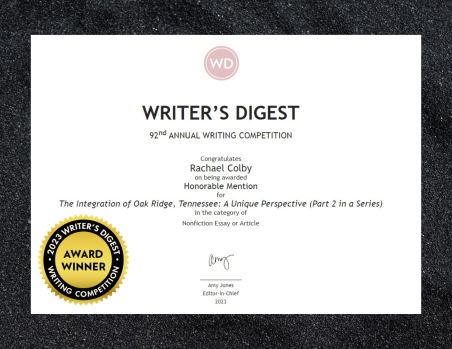 Previous Image Next Image 2023 WRITER’S DIGEST 92nd ANNUAL WRITING COMPETITION Rachael M Colby Honorable Mention for article The Integration of Oak Ridge, Tennessee Share this:Tweet Email a link to a friend (Opens in new window) Email Share on WhatsApp (Opens in new window) WhatsApp Share on Reddit (Opens in new window) Reddit MoreLike Loading...