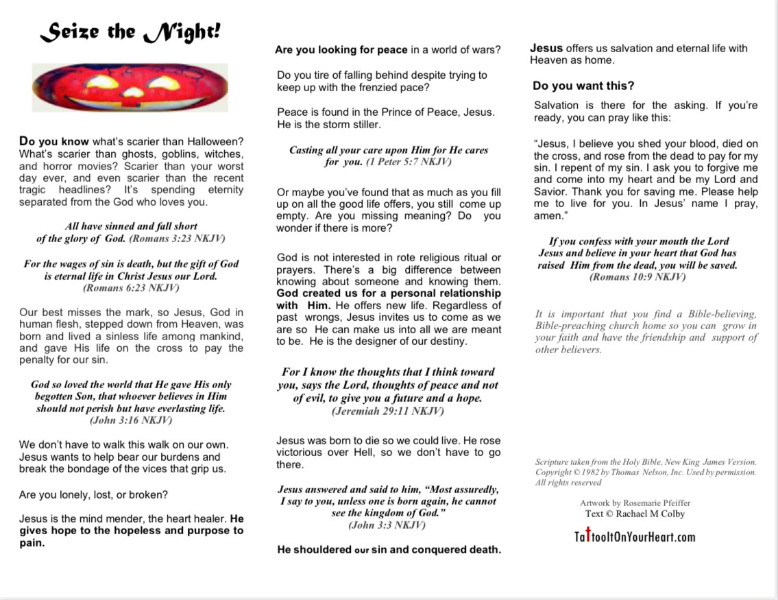 Download my FREE tri-fold #gospel #Halloween tract for distributing to visitors at your door and at church outreach events HERE.