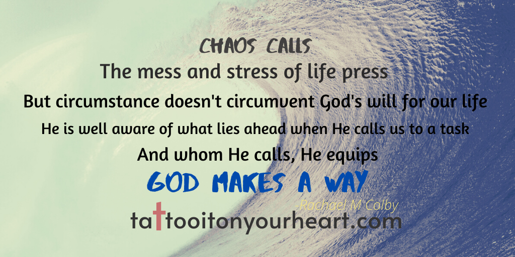 Previous Image Next Image Rachael-M-Colby-Tattoo-It-On-Your-Heart-Chaos-Calls-God-Makes-a-Way Share this:Tweet Email a link to a friend (Opens in new window) Email Share on WhatsApp (Opens in new window) WhatsApp Share on Reddit (Opens in new window) Reddit MoreLike Loading...