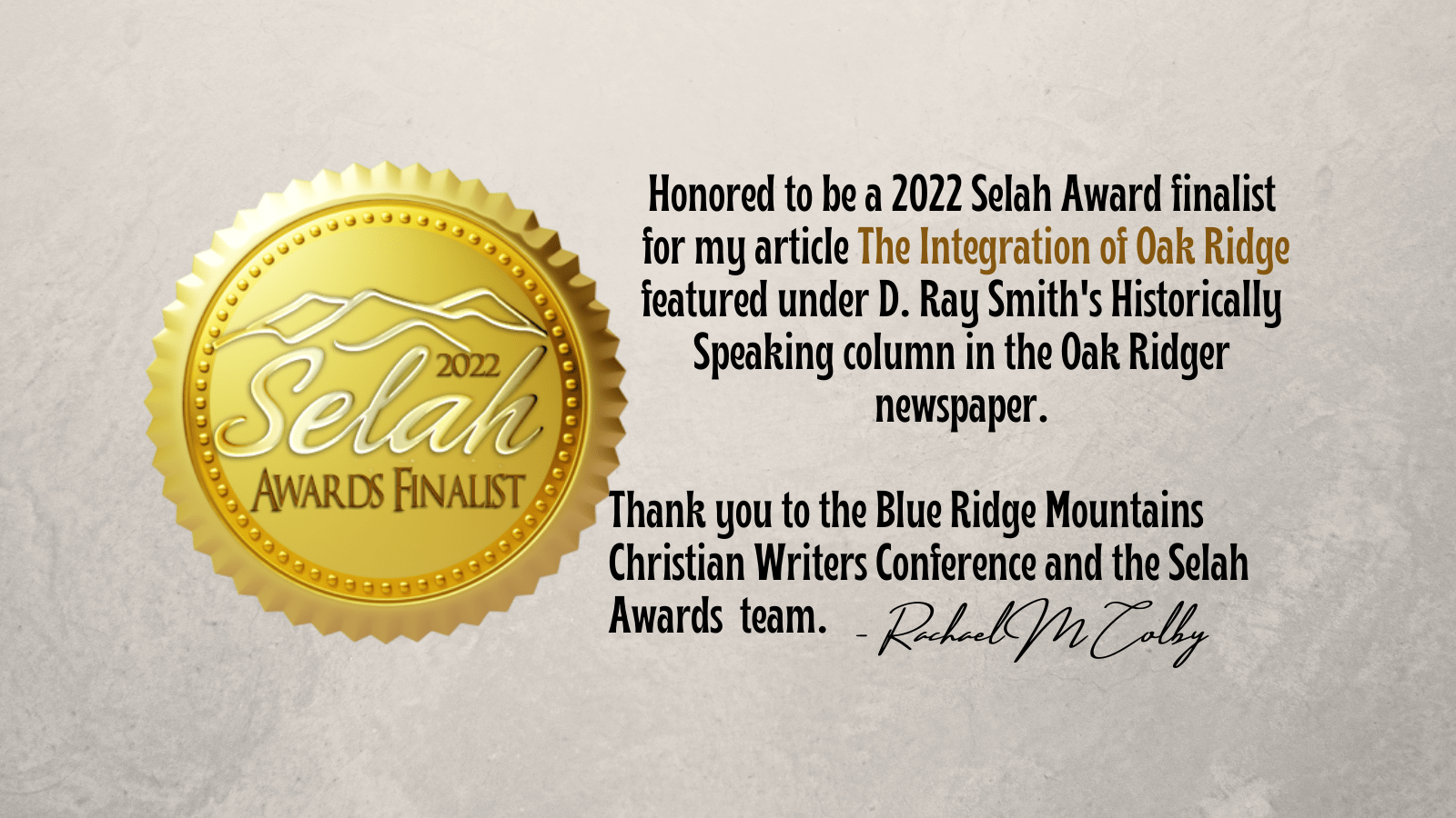 Previous Image Next Image Selah-Awards-Finalist-2022-The-Integration-of-Oak-Ridge-Rachael-M-Colby Share this:Tweet Email a link to a friend (Opens in new window) Email Share on WhatsApp (Opens in new window) WhatsApp Share on Reddit (Opens in new window) Reddit MoreLike Loading...